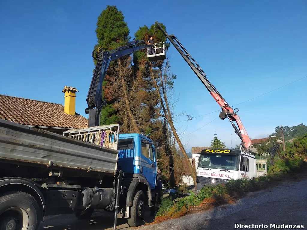 Camiones con grúa, pinza y cesta para servicios de construcción, poda de árboles y recogida de escombros. Venta de tierra y piedra.
